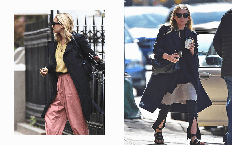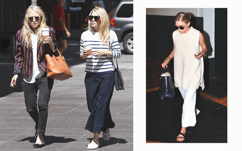 Сестры Олсен создавали расслабленные образы задолго до того, как это стало трендом, за что поначалу получали немало упреков. Их почти невозможно застать с аккуратной прической – только рассыпанные по плечам или собранные в торопливый пучок локоны. Они смело носят бесформенные сумки, вьетнамки с носками, заматываются в объемные шарфы и на снимках папарацци в основном выглядят так, будто надели то, что первое попалось под руку.