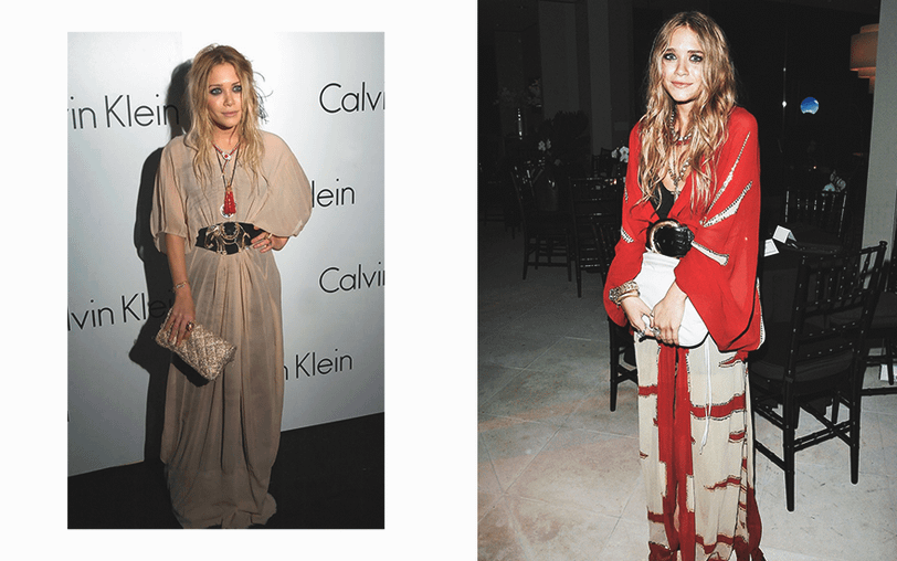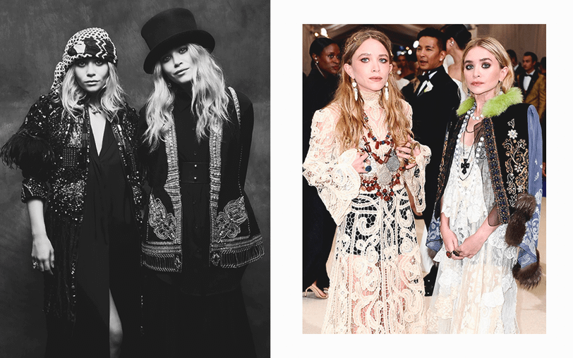 Тягу к небрежности в сочетании с творческим мышлением сестры Олсен часто воплощают в любимом стиле бохо-шик. Длинные платья прямого кроя с многослойной драпировкой или этническими узорами, изысканные накидки до пола из шелка с меховой отделкой, платья с силуэтами 20-х годов прошлого века – воплощение образа нью-йоркской богемной девушки.