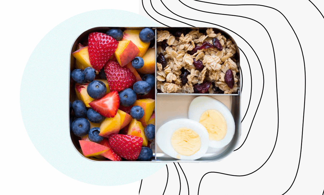 В этом сытном обеде есть вареное яйцо, овощи, десерт из фруктов и ломтиков гранолы, а также макаронный салат.