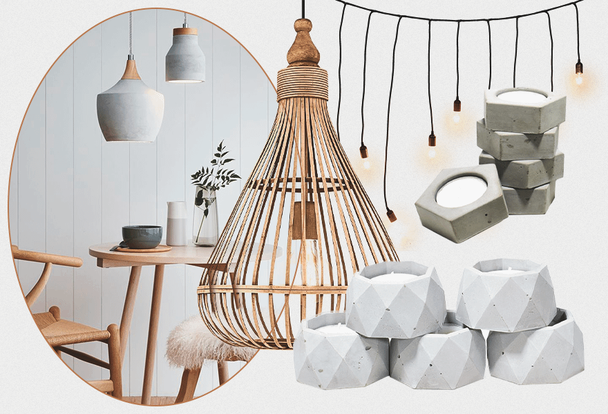Можно интегрировать в интерьер встроенные светильники или подвесные на длинном шнурке, бра с плафонами лаконичной формы и декоративные гирлянды и фонарики, создающие приятный рассеянный свет. Ну и, конечно, не забудь о свечах — можно купить красивые ароматические или обычные чайные, поместив их в бетонные подсвечники, что вполне характерно для стиля хюгге.