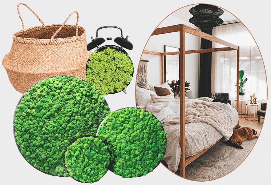 Сделай ставку на плетеные корзины для хранения и цветочные кашпо, однотонные меховые коврики, керамические вазы и, конечно, растения — как живые, так и в виде сухоцветов. Интересным решением станут часы, фоторамка на стену, картина или панно из стабилизированного мха или цветов, как у компании GOODLY STUDIO. Они не требуют ухода, добавляют природной яркости и позволяют моментально оживить даже однотонный интерьер. Есть стандартные варианты и с подсветкой — простое и стильное решение для любого помещения.