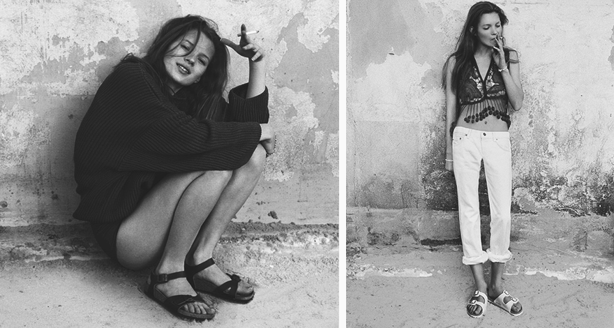 1990 год, британская фотограф Коринн Дэй сняла фотосет с никому не известной Кейт Мосс — девушка предстала сидящей на песке, без макияжа, вычурной прически и в позе, модной в то время — естественность как есть. Снимок вмиг стал скандально популярным: мало того, что Кейт снималась топлесс, так еще и надела биркенштоки. Надо сказать, что носили их в основном бунтари: например, солистка Sonic Youth Ким Гордон. Позже на них обратили внимание молодые звезды вроде Софии Копполы и Хлое Севиньи, а затем ортопедические сандалии и вовсе стали предметом первой надобности у контркультурных модников.