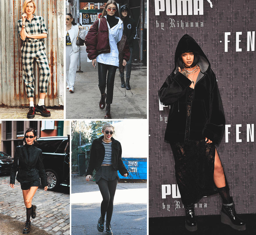 Подчеркнутая универсальность грубых ботинок была вновь замечена, и сегодня их можно смело отнести к списку вещей must have. Многие мировые бренды, в том числе Louis Vuitton, Alexander McQueen, Jimmy Choo, Saint Laurent, Celine, Chloé и Lanvin, вовсю эксплуатируют их на подиумах. Селебрити вроде Кендалл Дженнер, Джиджи Хадид, Рианны, Агнесс Дин и Майли Сайрус носят их на любые мероприятия и просто на прогулку.