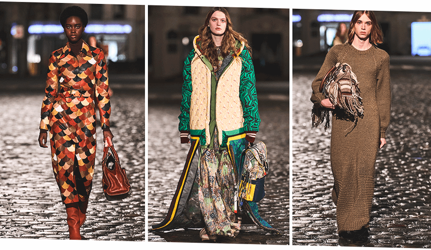 Chloé и вовсе погружает зрителя в мир фантазии, где господствует устойчивость. Так, во время осенней коллекции 2021 года бренд представил кожаное пальто из разноцветных лоскутов в виде чешуи, стеганые пуховики, похожие на домашние одеяла, и сумки, связанные из разноцветной пряжи.