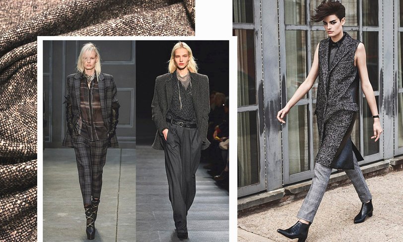 Твид хорош тем, что разнообразен не только в расцветках и фасонах. Характер вещи придает и вид плетения: это может быть как гладкая однотонная ткань, так и мелкая «елочка».