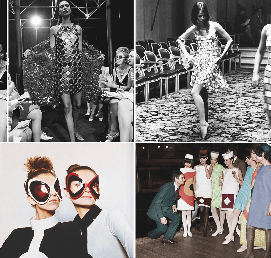 В начале этой эпохи дизайнеры постепенно заставляли общественность вспомнить о бижутерии из синтетических материалов, однако настоящую революцию совершили Пьер Карден, Пако Рабан, Андре Курреж и другие модельеры, которые вовсю творили в 60-е. Рабан представил в феврале 1966-го коллекцию «12 платьев, сделанных из современных материалов, которые нельзя носить» — она состояла из вечерних платьев, купальников, солнцезащитных очков, головных уборов, сумок — и все из пластика! Позже дизайнер и вовсе создал платья-кольчуги из родоидных колец, скрепленных проволокой.