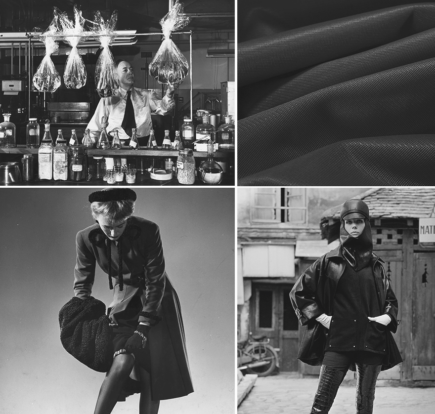 В 1930-х Эльза Скиапарелли создала кейп из ПВХ и впервые за всю историю использовала пластиковые потайные молнии. Позже верхнюю одежду из поливинилхлорида создавала и Шанель — она облачила актрису Мишель Морган, снимавшуюся в «Набережной туманов», в непроницаемый плащ.