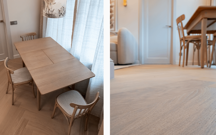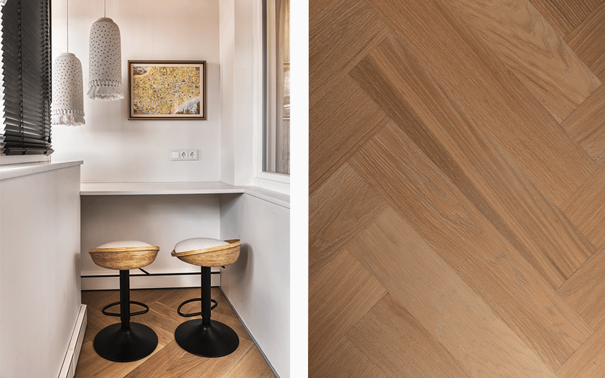 В обоих случаях, чтобы лоджия не выглядела инородно, рекомендуем объединить пространство с помощью отделки стен и пола. Для этой задачи хорошо подойдет покрытие, которое можно укладывать одним полотном без стыков. С кварцевым паркетом так можно — он подходит для беспороговой укладки на площади до 144 м².
