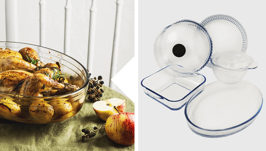 Стекло пропускает тепло лучше, чем металл или керамика, а стенки у такой посуды, как правило, толще. Поэтому для запекания блюд она подойдет лучше — вся поверхность формы нагреется равномерно. Обычное стекло может треснуть от высокой температуры, но с жаропрочным такого не произойдет — оно выдерживает температуру до +240 °С.