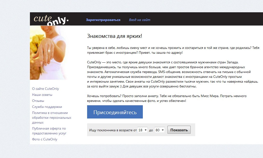CuteОnly — это сервис, на котором девушки знакомятся с мужчинами из стран Запада. Им пользуются десятки тысяч жителей развитых стран, которые ищут спутницу жизни из России и СНГ.