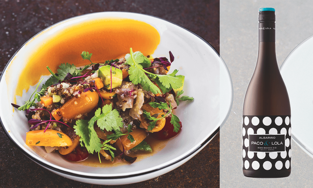 Какое вино подойдет: Paco&Lola, «Lolo» Albarino, Rias Baixas – насыщенное сухое вино изящного золотистого цвета, изготовленное из винограда в подзоне Валь ду Сальнес в Испании. Оно отличается свежим вкусом с оттенками цитрусовых фруктов и ароматных трав. Демонстрирует легкий аромат белых цветов с выраженными нотами персика и спелой груши. Лёгкое и искристое оно порадует не только своим вкусом, но и легкоузнаваемой, очень позитивной этикеткой в белый горох.