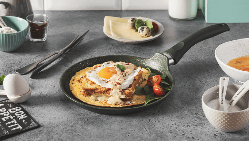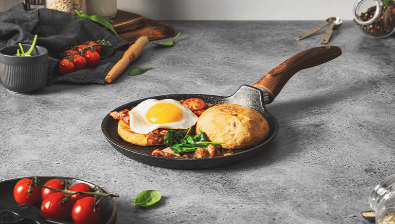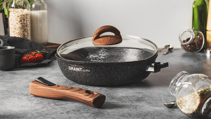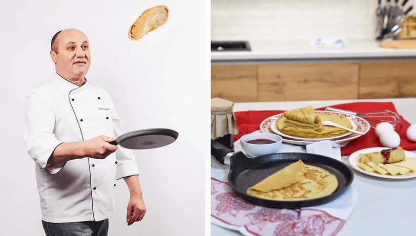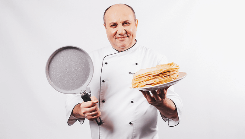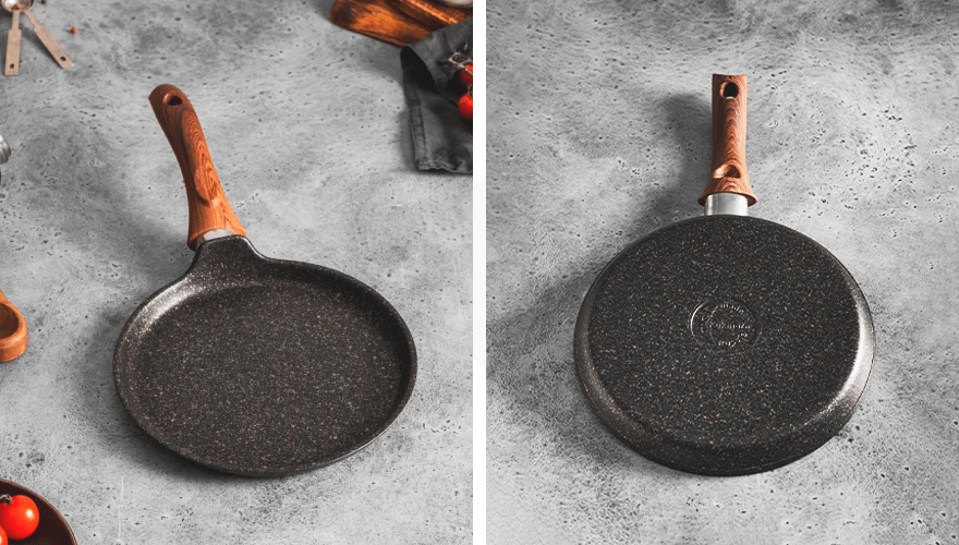 Для жарки блинов лучше брать посуду с толстым дном и низкими бортами. Например, специальная сковородка из литого алюминия от Kukmara. Она оснащена антипригарным покрытием Ultra granit, которое усилено сверхтвердыми материалами нового поколения, близкими по твердости алмазу. С ней все твое колдовство над тестом не пройдет даром — блинчики получатся идеальными.