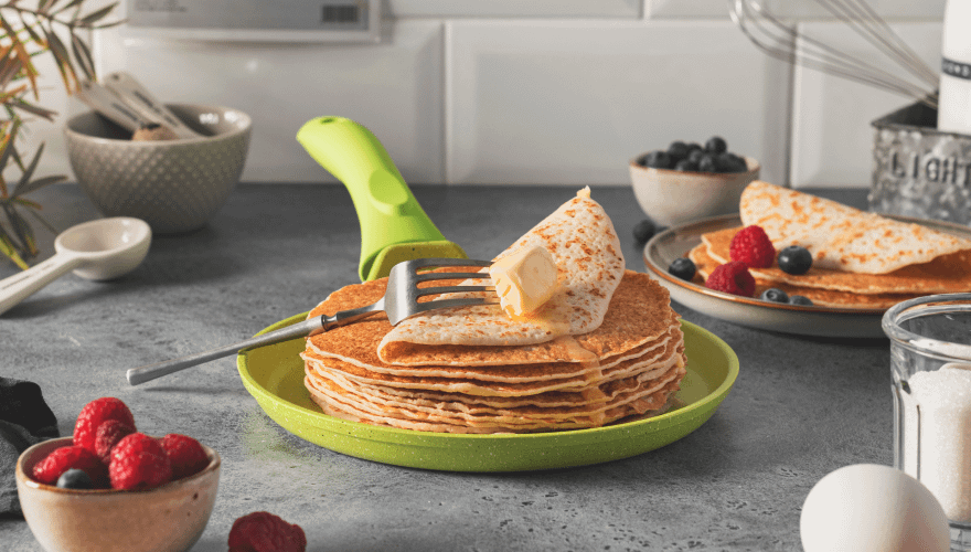 Перед тем, как перевернуть блин, пройдись лопаткой по его краям, отслаивая их поверхность от сковородки. Это не составит труда, если посуда будет качественной.