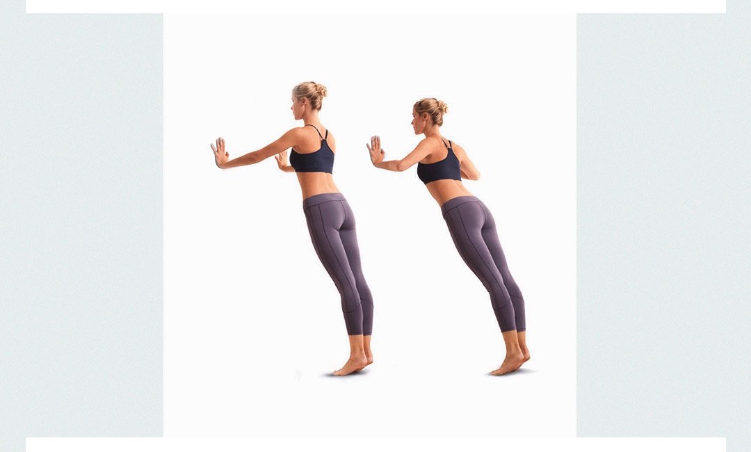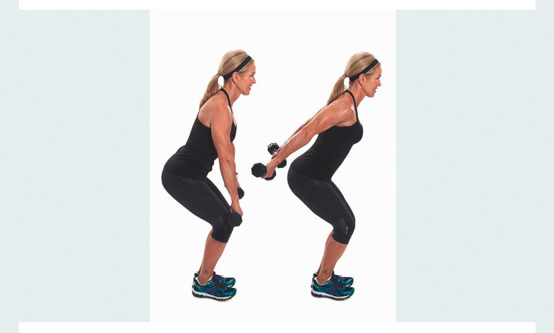 Поставь ноги на ширине плеч, втяни живот, руки с гантелями опусти вдоль тела. Согни колени, а затем начинай уводить руки с гантелями за спину. Повторяй 8-12 раз.