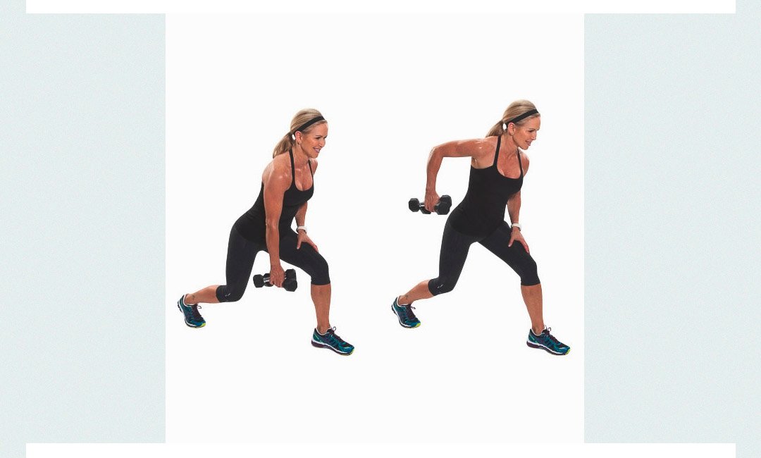 Поставь левую ногу вперед, согни левое колено и наклонись под углом 45 градусов, чтобы добиться прямой линии от пятки до головы. Левую руку поставь на бедро, правую — вытяни вниз вместе с гантелей. Сгибай правый локоть и поднимай гантелю к груди, а затем медленно возвращай в исходное положение. Повтори 7-8 раз, а затем поменяй стороны.
