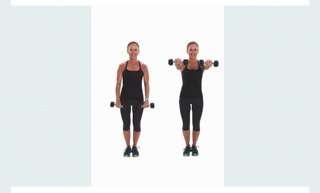 Поставь ноги вместе, руки с гантелями опусти вдоль тела. Втяни живот, выпрями плечи. Поднимай гантели медленно до уровня плеч и так же медленно опускай их обратно. Избегай раскачивания или резких движений. Повторяй 8-12 раз.