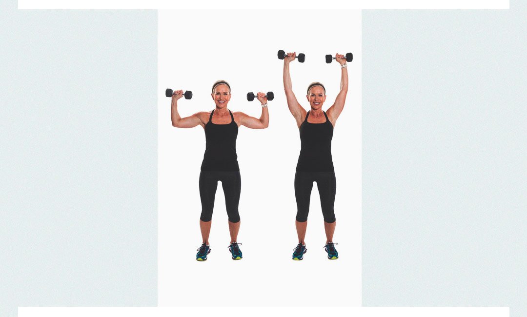 Поставь ноги на ширине плеч, подними руки с гантелями в стороны и согни их под углом 90 градусов. Вытягивай руки вверх над собой, а затем возвращай их в обратную позицию. Следи за тем, чтобы угол сгиба сохранялся. Выполняй 10-15 раз.