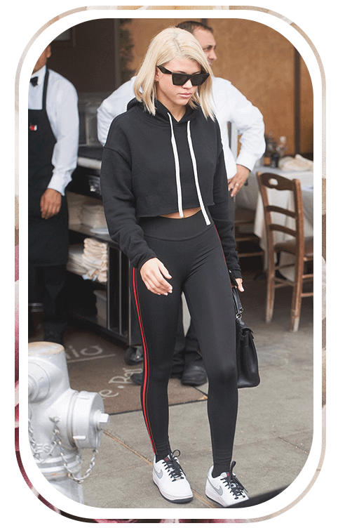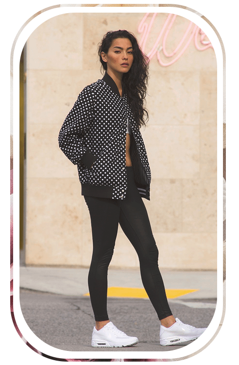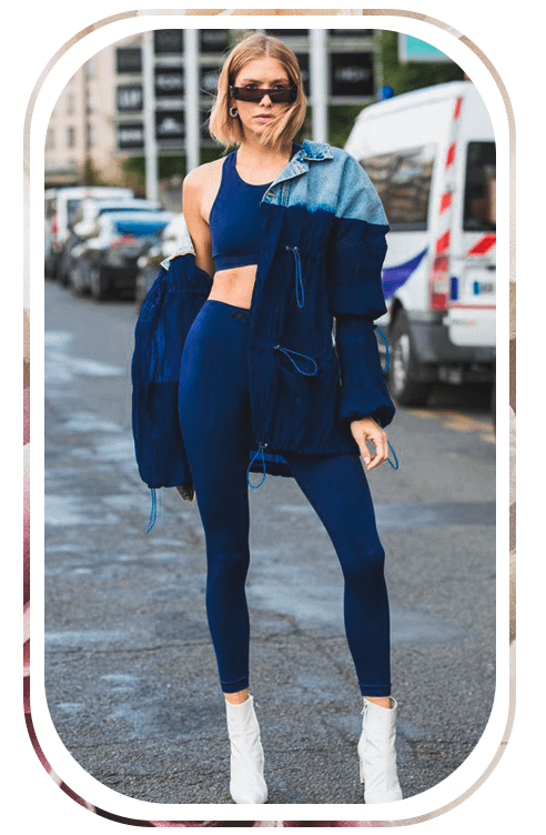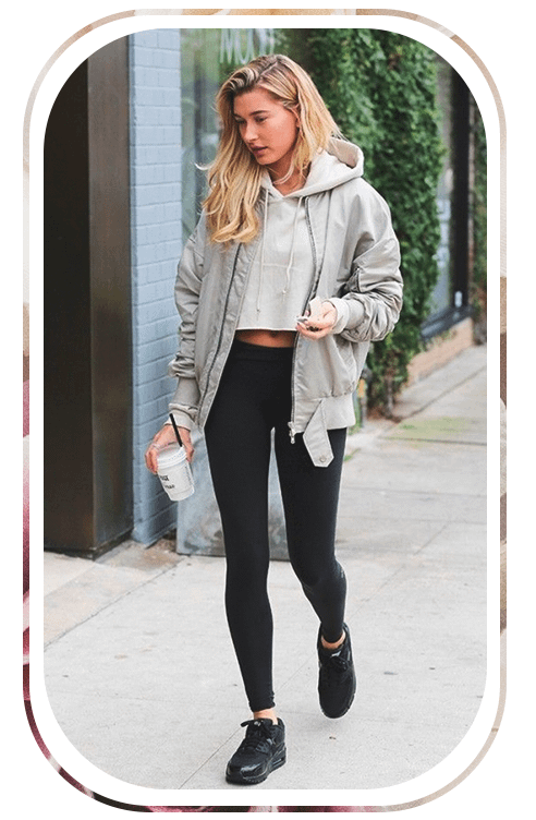 Легинсы с укороченной толстовкой — отличное решение для спортивного образа. Выбирай модели легинсов с высокой посадкой, а толстовку не слишком обтягивающего фасона. Так ты правильно расставишь акценты и сделаешь свой образ стильным. А дополнить его можно кроссовками в тон легинсам или контрастного оттенка.