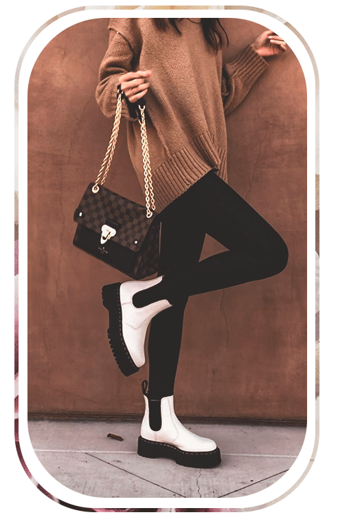 Сочетание черных легинсов с ботинками такого же оттенка визуально удлиняет ноги и является хорошим сочетанием для многих стильных образов. Можешь выбирать и контрастную обувь: она смотрится эффектно и приковывает внимание.