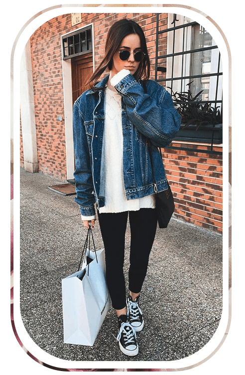 Легинсы отлично сочетаются с джинсовыми куртками. Подойдут как укороченные модели, так и более свободного фасона.