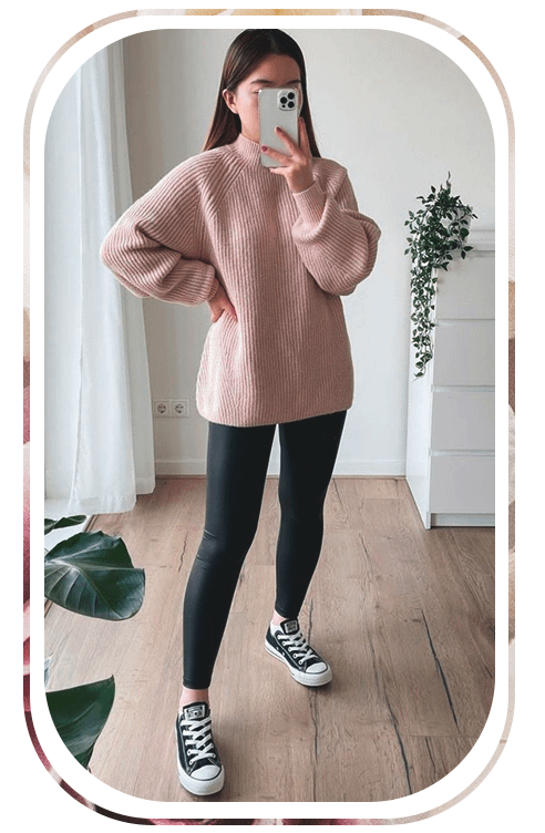 Объемный свитер и легинсы создают стильный контраст форм, который эффектно подчеркнет твою фигуру. К тому же можно выбирать любую актуальную модель свитера: с широкими рукавами, высоким воротником или модели с «перепадами» в длине подола. А еще эффектно выглядят сочетания яркого свитера с черными легинсами.