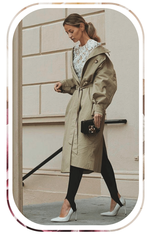 Образ с легинсами получается достаточно эффектным, если дополнить его тренчем или пальто. Можно использовать монохромную цветовую гамму или сделать акцент на верхней одежде. С таким нарядом органично будут смотреться кроссовки и обувь на каблуке, что позволит экспериментировать с образами.