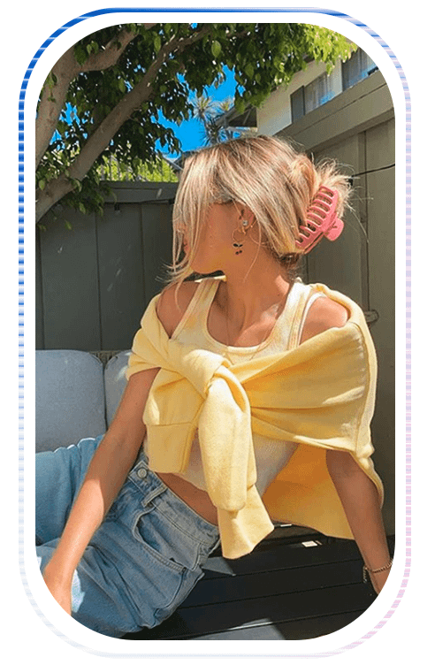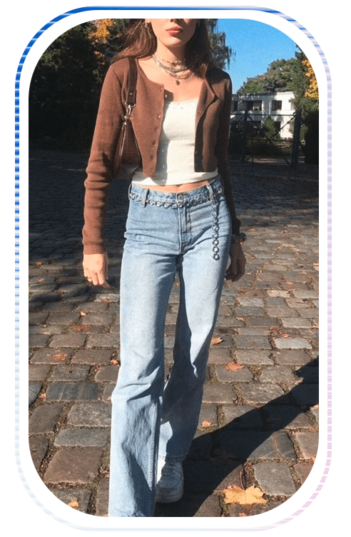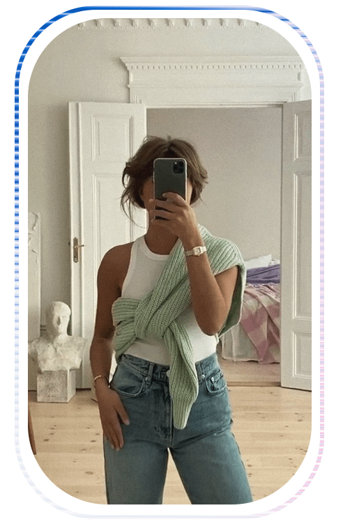 Если твоя задача — создать женственный образ в стиле конца 90-х, смело сочетай в одном образе майку-алкоголичку и теплый свитер в пастельном оттенке. Накинь его на плечи или завяжи его узлом у линии груди, чтобы образ получился максимально комфортным и расслабленным. Такое сочетание идеально дополнят классические голубые джинсы со средней или высокой посадкой, минималистичные украшения и слегка небрежная прическа.
