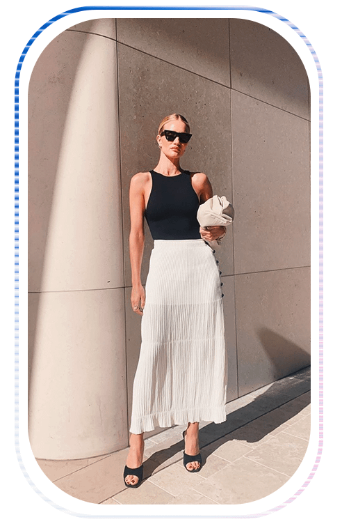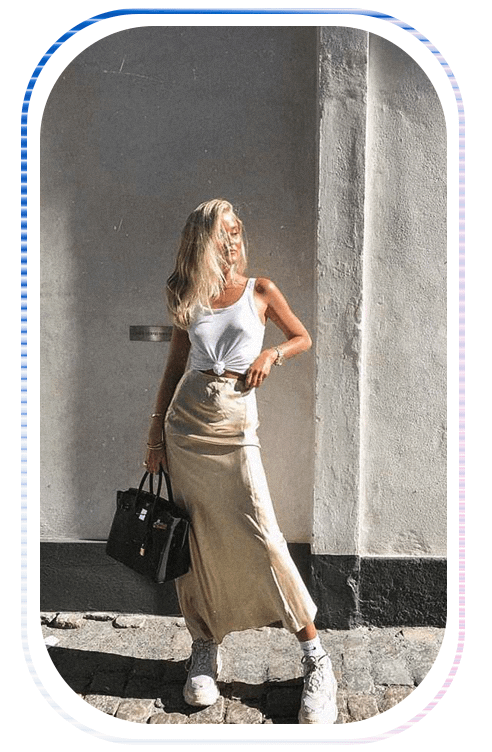 Длинная юбка из легкой ткани и майка-алкоголичка — идеальное сочетание для жарких летних дней. Такой образ выглядит не только женственно, но и уместно в любое время дня. Особенно актуально этой весной и летом сочетание обтягивающей майки-алкоголички с макси-юбкой с высокой талией и глубокой шлицей спереди. В качестве аксессуаров рекомендуем использовать винтажные очки и стильную сумку необычной формы или цвета.