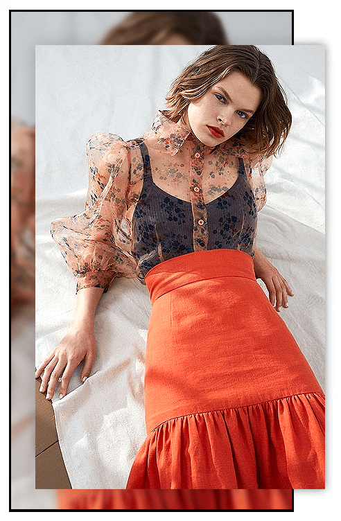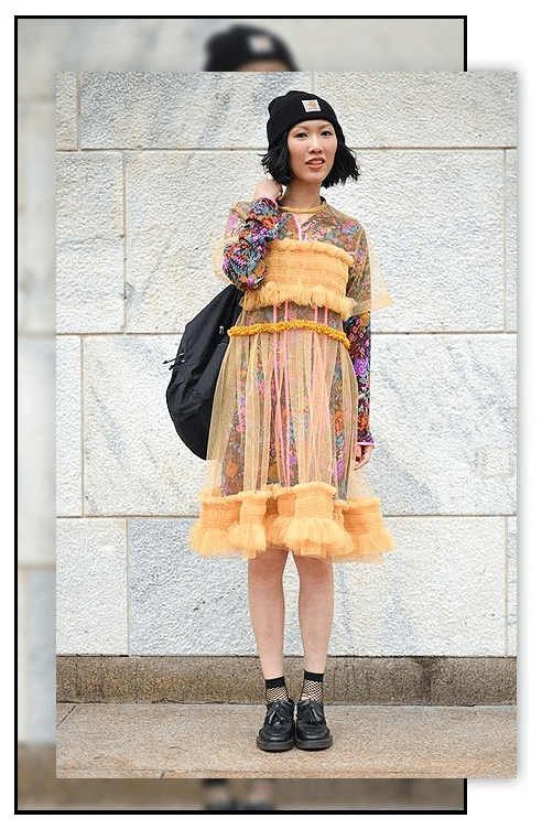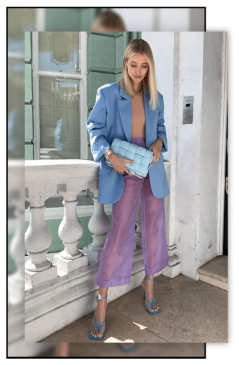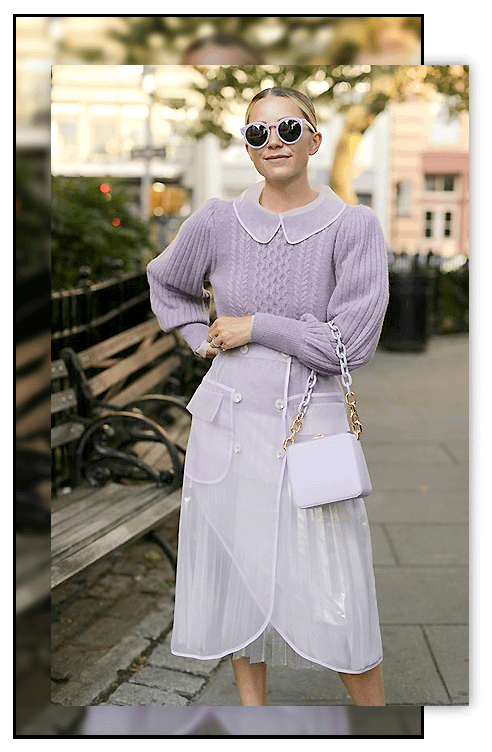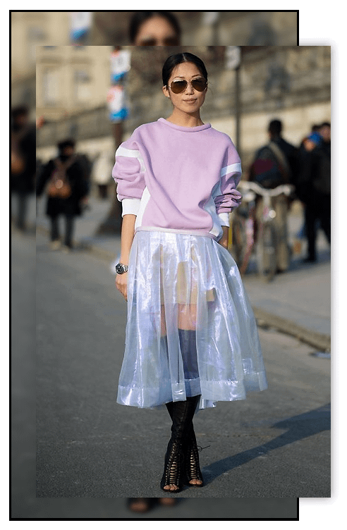 Чаще всего модные инфлюенсеры создают монохромные образы с полупрозрачной юбкой. Например, в оттенках трендового лавандового, желтого или розового цветов.