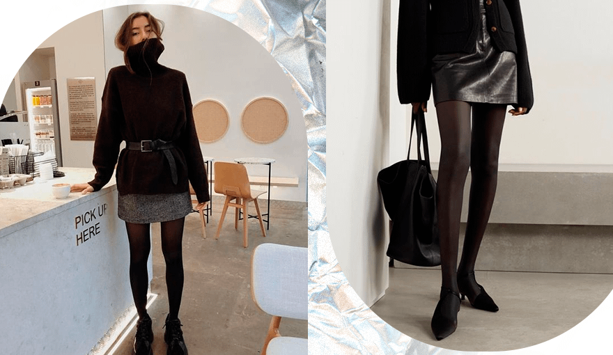 Это самый простой способ носить укороченные платья и юбки зимой, не подвергая риску свое здоровье. Как правило, девушки выбирают плотные черные колготки, но это вовсе не обязательно.