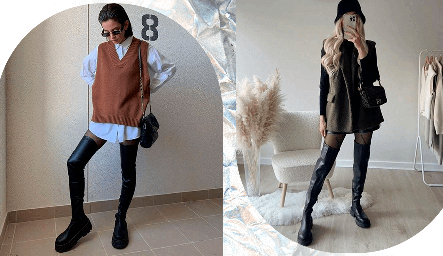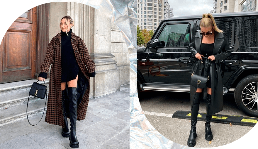 Высокие сапоги остаются в тренде несколько сезонов подряд. Они довольно эффектно выглядят и хорошо подходят для создания образа с мини-юбкой или укороченным платьем. За счет того, что большая часть ноги остается закрытой, аутфит выглядит уместно даже в холодный лень.