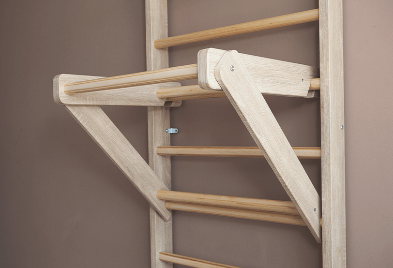 Популярный выбор — гимнастическая стенка, дополненная съемным турником, доской для пресса, веревочной лестницей, канатом и кольцами. Такой набор элементов позволяет одновременно развивать все группы мышц, в том числе кора, рук и ног.