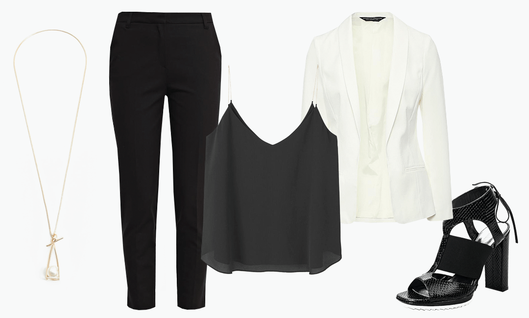 Чтобы выглядеть роскошно, строго и сексуально одновременно, совершенно не обязательно выбирать дорогие или не совсем комфортные вещи. Всё, что вам нужно, — это правильные аксессуары. Эмма Уотсон знает, как комбинировать базовые цвета. В данном луке отлично сочетаются обыкновенные классические брюки укороченного фасона, простой топ из тонкого материала и белый жакет, свободный или облегающий, на ваш вкус. Чтобы добавить изюминку в такой простой гардероб, наденьте туфли или босоножки на высоком каблуке либо яркого цвета, либо нестандартного фасона. С черно-белым луком отлично будет смотреться золото и красные детали.