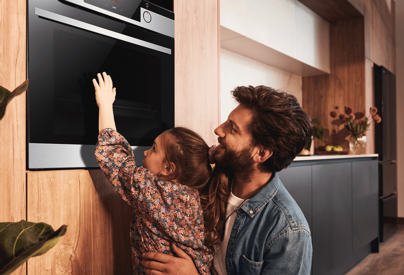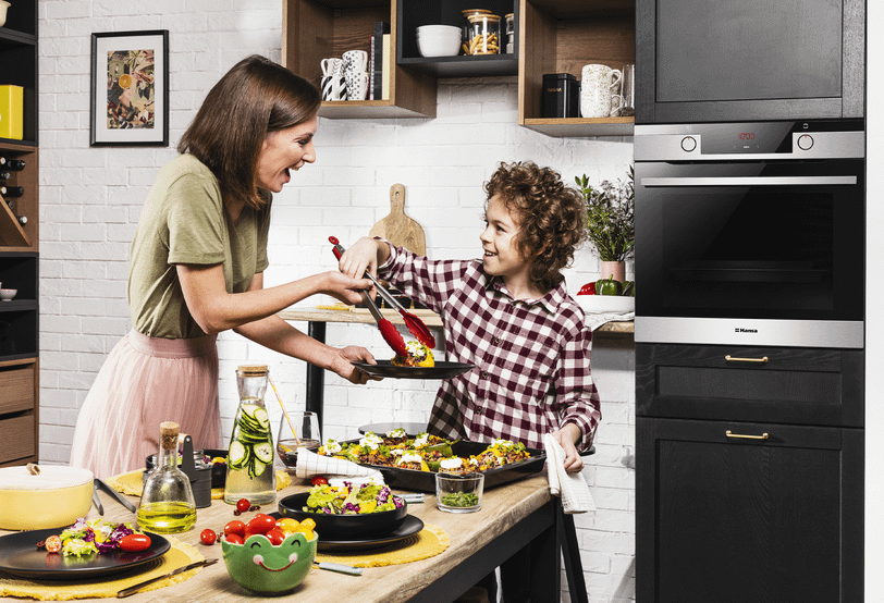 Чтобы бытовая техника была практичной, стильной и безопасной, рекомендуем выбирать встраиваемые модели с большим объемом камеры, например, духовой шкаф серии BakingPro от Hansa. Все духовки BakingPro очень вместительные — объем камеры целых 77 литров, имеют большие противни, а до 150 °C духовка разогревается за 3 минуты. Ты сможешь готовить несколько блюд одновременно — когда ужин ждет вся семья, каждая секунда на счету.