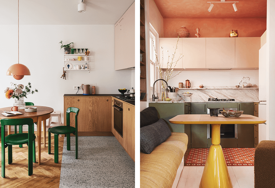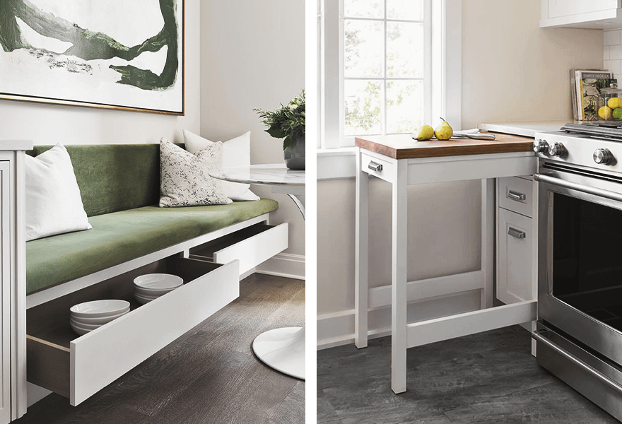 Столы-книжки, складные стулья и мебель со скрытыми ящиками здорово выручат семьи даже с очень маленькими кухнями. Например, если вы редко завтракаете и ужинаете все вместе, вам не нужен большой стол каждый день — достаточно будет предусмотреть возможность раскладывать его при необходимости. Чаще всего для кухонь выбирают откидные столы прямоугольной или квадратной формы.