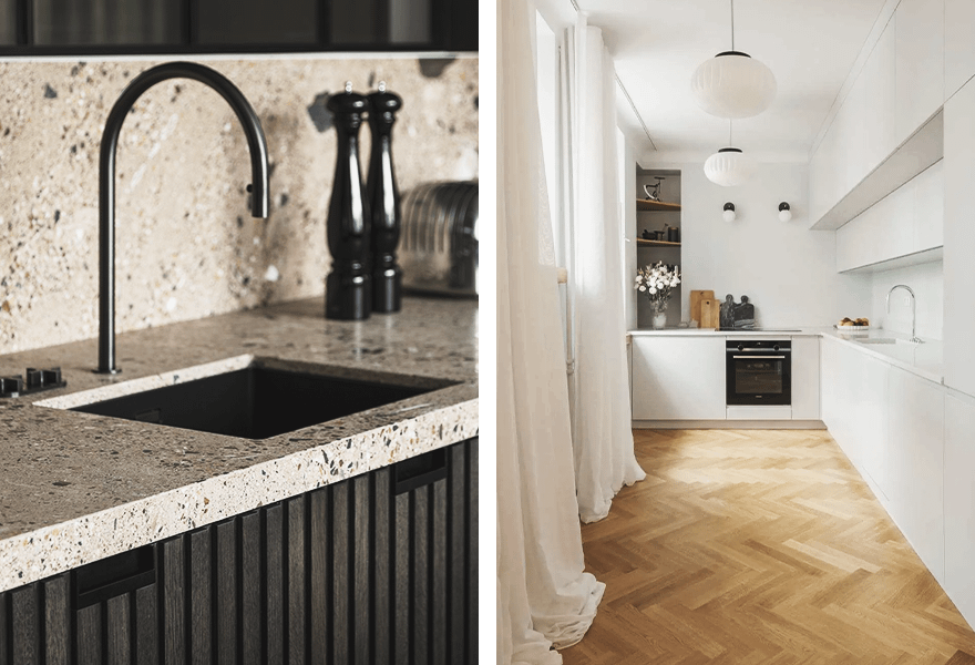 Для пола тоже лучше выбрать устойчивые материалы — мебель на кухне часто встраивается, а замена покрытия превращается в настоящий квест. Вместо традиционной плитки выбери что-то более прочное, например, тот же камень или кварцевый ламинат. В этом случае даже если ты уронишь на такой пол тяжелую кастрюлю или сковородку, с ним ничего не случится.