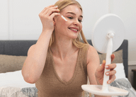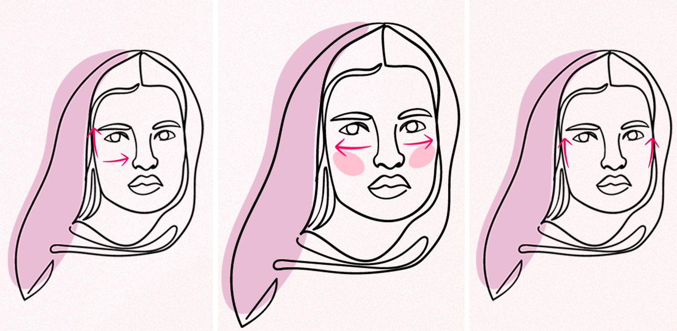 - положи правую ладонь тыльной стороной под глаз, а левую — к области виска. Медленно, слегка натягивая кожу, совершай одновременно двумя руками симметричные движения.