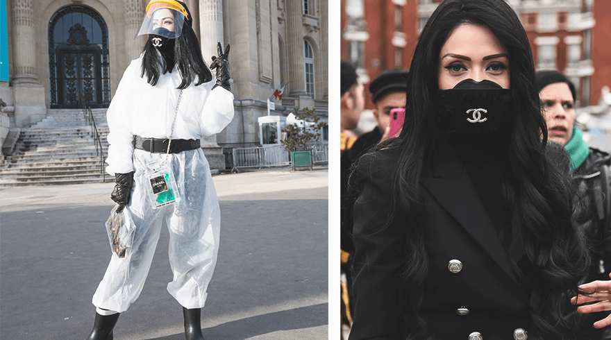 На парижской Неделе моды всеобщее внимание привлекла светская львица Николь Райдмон. Она использовала черную маску Chanel сразу в двух образах: со строгим черным жакетом и водолазкой в тон под ним, а также с белым защитным костюмом и козырком Chanel, защищающим глаза.