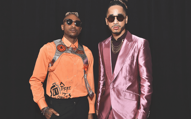 Более сдержанный образ с портупеей выбрал Чарльз Андерсон из группы Social House. Он надел серебристый нагрудник Louis Vuitton с оранжевыми нашивками, сделанный специально на заказ.