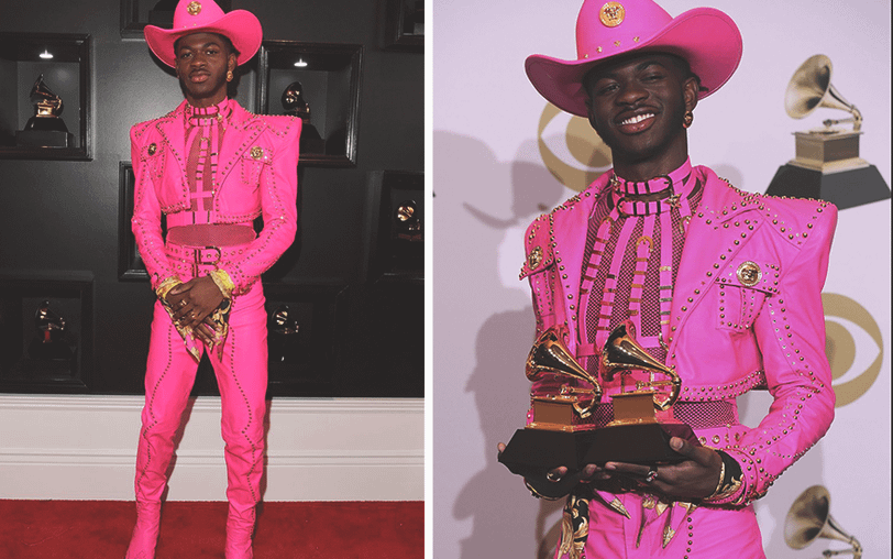 Но самым ярким выходом с портупеей в 2020-м пока остается появление рэпера Lil Nas X на «Грэмми». Он был одет в ярко-розовый костюм Versace: ковбойская шляпа, укороченный жакет, узкие брюки, переходящие в сапоги, сетчатый топ, поверх которого портупея в тон, украшенная золотыми подковами.