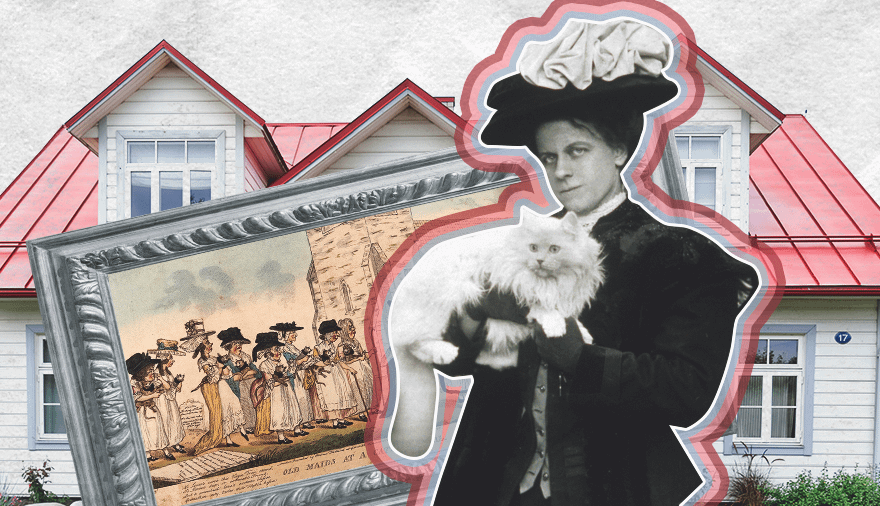 Согласно мнению общества, женщина теряла всякое чувство приличия, если в зрелом возрасте оставалась без мужа и при этом в ее доме жила кошка. А образ «одинокой кошатницы» находил отражение в искусстве. Ярким примером является гравюра Джона Петтита 1789 года «Старые девы на похоронах кошки».