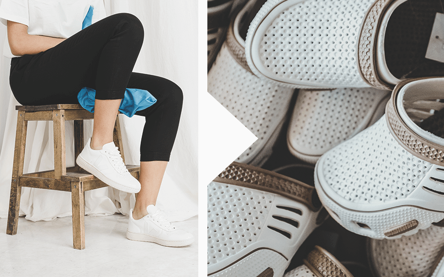 Идеальный выбор — кроссовки нейтрального цвета с анатомической подошвой, кеды или кроксы. Выбирай обувь на полразмера больше: к концу дня ноги могут отекать. Не скупись на удобную пару, ведь от ее качества зависит состояние твоих стоп. Если нет возможности взять новые кроссовки — позаботься об ортопедических стельках или плотном нескользящем коврике: с его помощью ты снизишь давление на ноги.