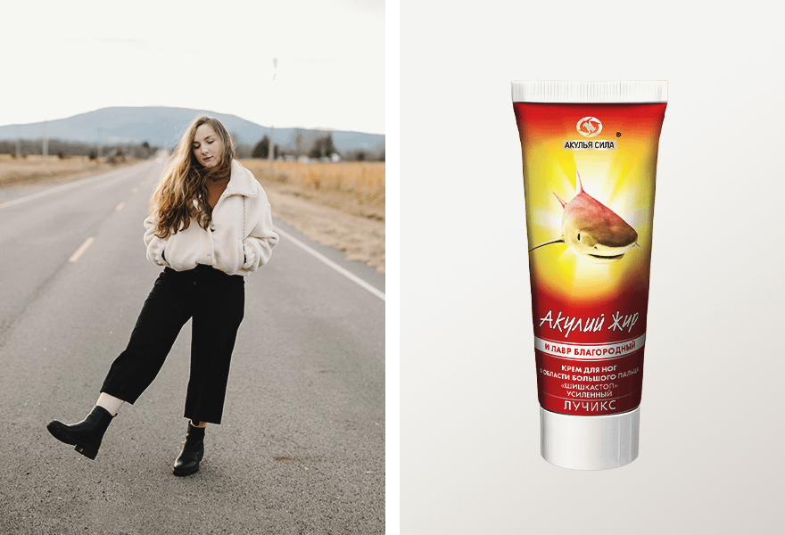 Если у тебя нет возможности регулярно переобуваться или сложно подобрать подходящую обувь, позаботься о ногах перед выходом из дома и вечером. Крем от шишек и болей в ногах «Акулья сила – Акулий жир и лавр благородный — ШишкаСтоп» снимает боль, отек и воспаление, размягчает мозолистые образования и отложение солей кальция. Вместе с массажем и ортопедическими приспособлениями это поможет снизить нагрузку на пальцы и стопы.