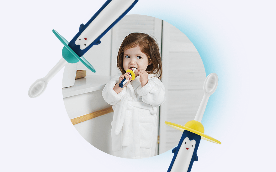 Эффективнее всего дети осваивают навыки в процессе игры — добавь в купание развивающие активности. Хорошей идеей будет научить малыша чистить зубы — мягкая щетка в форме пингвинчика бережно удалит налет и не повредит десны, а ограничитель в форме шляпки-сомбреро не даст заглотить щетку по неосторожности.