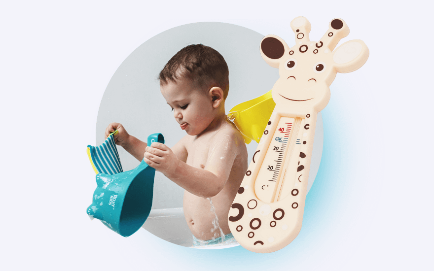 Повесь на внутреннюю стенку ванночки градусник, например детский термометр от ROXY-KIDS. Его можно оставить в воде во время купания: термометр не тонет и не содержит ртути. А яркий дизайн наверняка понравится твоему малышу и займет его внимание.