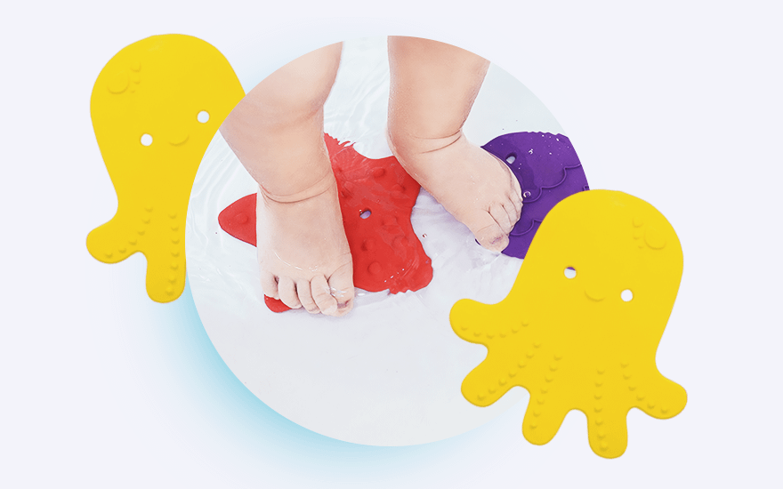 Можно постелить один коврик, который закроет все дно, или несколько маленьких нескользящих ковриков в форме морских животных. Они помогут ребенку получить новые тактильные ощущения, запомнить формы и выучить названия морских обитателей.