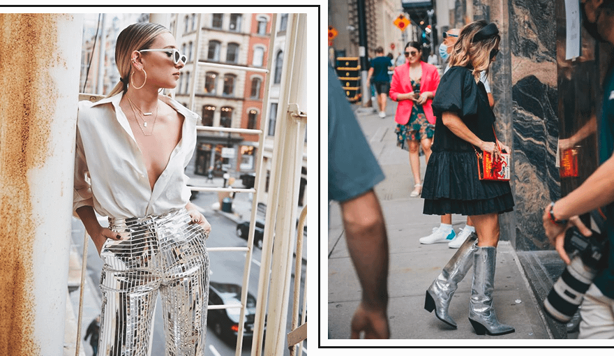 Если твоя задача — разбавить классический офисный лук, перед походом на вечернее мероприятие переобуйся в сапоги в оттенке металлик либо замени «металическими» брюками базовые офисные.