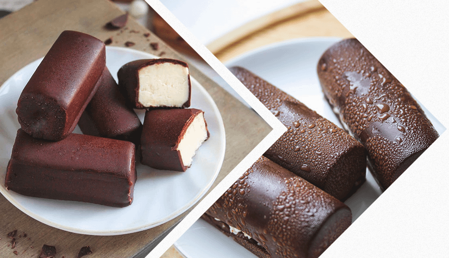 300 граммов творога смешай с чайной ложкой сахарной пудры и каплей растительного масла. Сформируй прямоугольные сырки и убери их в морозильник на 15 минут.