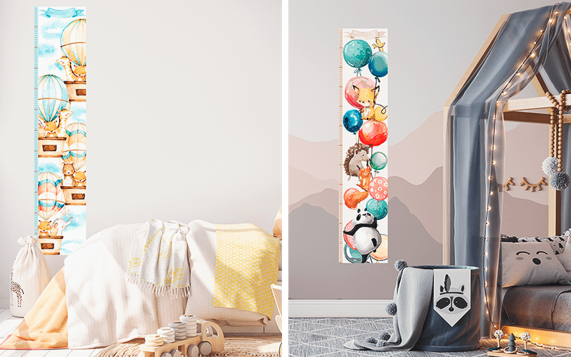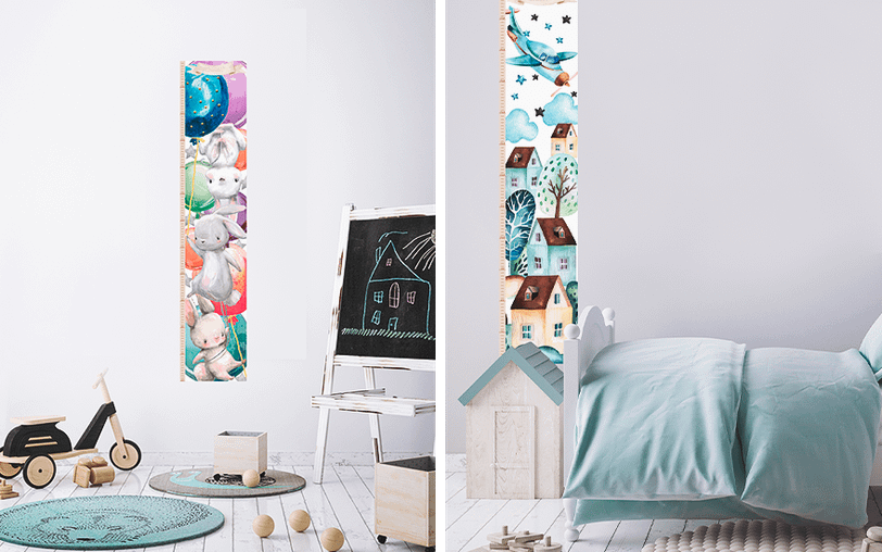 Такой вариант декора подойдет для детской или стены в любой другой комнате, которую ты готова выделить под измерения. Наиболее удобный вариант — ростомеры-наклейки: они с легкостью клеятся на любую гладкую поверхность, позволяют отслеживать динамику роста и развития ребенка, не оставляя на стенах некрасивые насечки, и вместе с тем выполняют декоративную функцию. Сделай ставку на яркие принты: пышные цветочные букеты пастельных тонов, забавные зверята с воздушными шариками, пролетающий над домами и деревьями самолет — все они смотрятся выигрышно и нарядно, помогают быстро оживить сдержанный интерьер и, что самое главное, нравятся детям, превращая измерение роста в увлекательную игру. Идеально, если ростомер будет цельным — не придется тратить время и нервы на стыковку деталей.