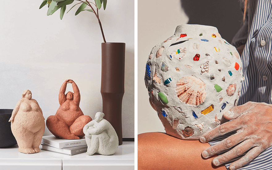 Керамические скульптуры выглядят интересно и экзотично, а еще они находится на пике популярности из-за тренда на натуральные материалы и хендмейд. Элегантная ваза с цветами на полу или обеденном столе, интересные кашпо с суккулентами или фигурки на полках шкафа — достаточно добавить пару аксессуаров, чтобы придать обстановке живости и изменить восприятие всего интерьера. При этом необязательно искать керамику в оффлайн- или онлайн-магазинах, можно пойти в гончарную студию и слепить то, что тебе нравится, своими руками.